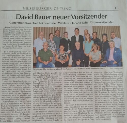 So treffen sich die Freien Wähler Velden gemeinsam mit den Kolleg:innen aus Vilsbiburg am 5. September zur Besichtigung der BRK Tagespflege. Sämtliche Mitglieder der beiden Vereine sind herzliche eingeladen an der Besichtigung teilzunehmen. Treffpunkt ist um 19 Uhr direkt an der Tagespflege am Marktplatz in Velden. Erstmals veranstalten die Freien Wähler einen Kulturabend. Am 28. Dezember kommt Kabarettist Christian Maier, bekannt aus „da Huawa, da Meier und I“, in den Bürgersaal im Veldener Rathaus. Karten gibt es bei Schreibwaren Kraxenberger und online unter www.christianmaier.net/